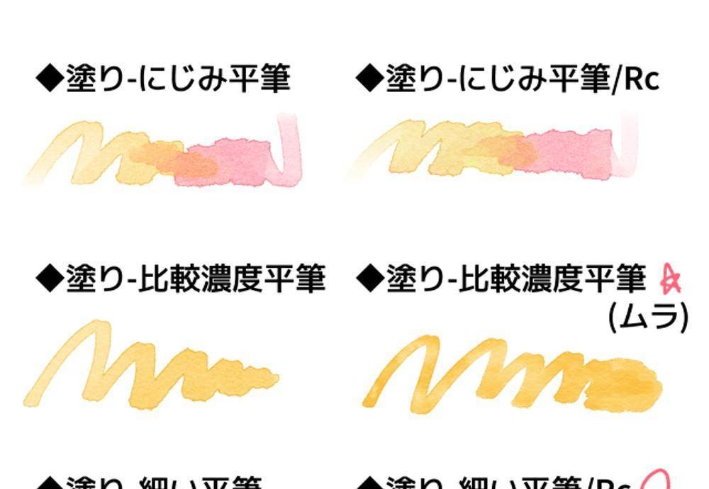 这是一套水彩风格的笔刷和纹理,我试图实现模拟的外观,添加了一个自定义画笔(笔刷名称中带有 "Rc"),使用CSP 1.10.5中添加的画笔设置,具有强烈的色彩不规则性。还添加了一个自定义画笔,它使用了CSP 1.10.10版本中添加的 "双画笔 "设置,并进行了调整,使其在感觉和处理上都像水彩画,里面还包括一个平刷和一个条纹刷。