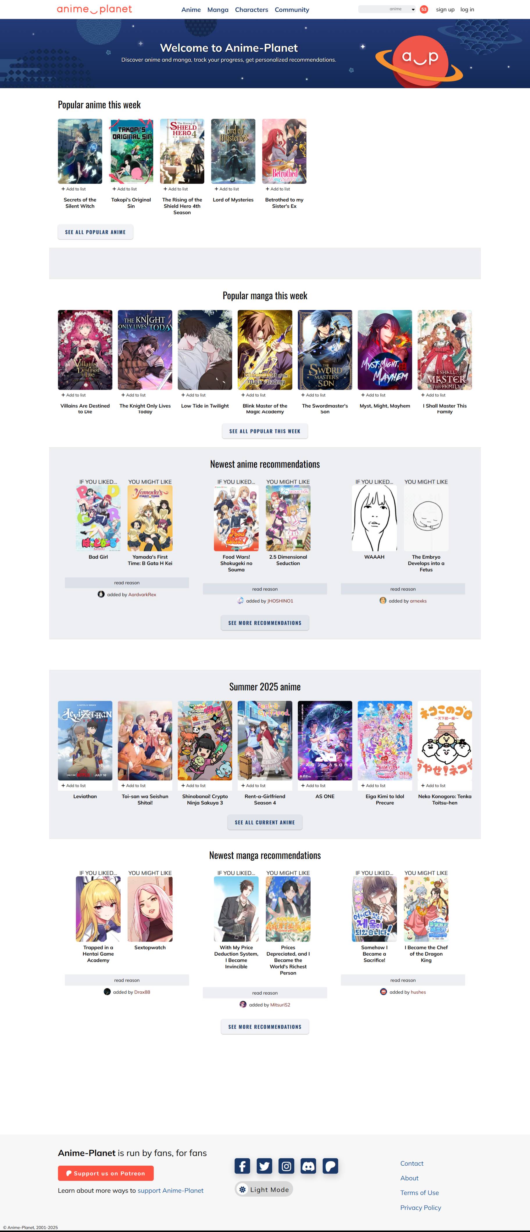 anime-planet这也是一家动漫、漫画百科资讯信息网站,大家也可以叫它动漫星球,网站成立于2001年。该网站主要收集世界各地的动漫、漫画作品信息,各个作品都有评论和打分的参考,并且主页上面有推荐最新的动漫信息。该网站还会根据你浏览的动漫或漫画,进行相关的推荐,让你更方便找到自己喜欢的动漫、漫画作品。