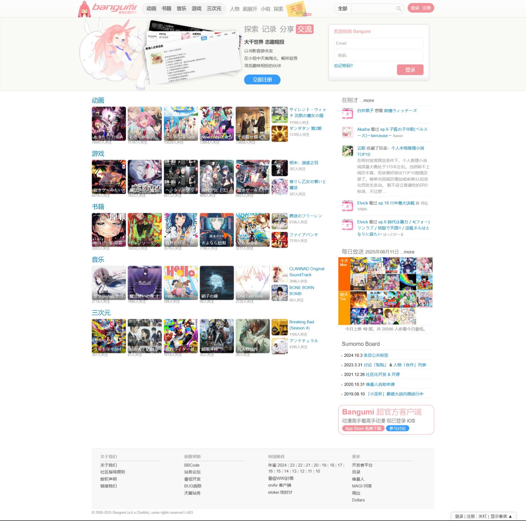 Bangumi是一个存在时间很久的动漫、漫画百科网站,里面收集了众多的动漫、漫画信息数据,提供给大家进行阅读和讨论、打分。如果你是一个喜欢动漫、漫画的爱好者,可以在该网站进行查阅资料和其他爱好者一起讨论自己喜欢的动漫、漫画作品。该网站除了动漫、漫画信息外,还额外提供游戏、音乐、三次元的相关信息,大部门都是二次元相关的。