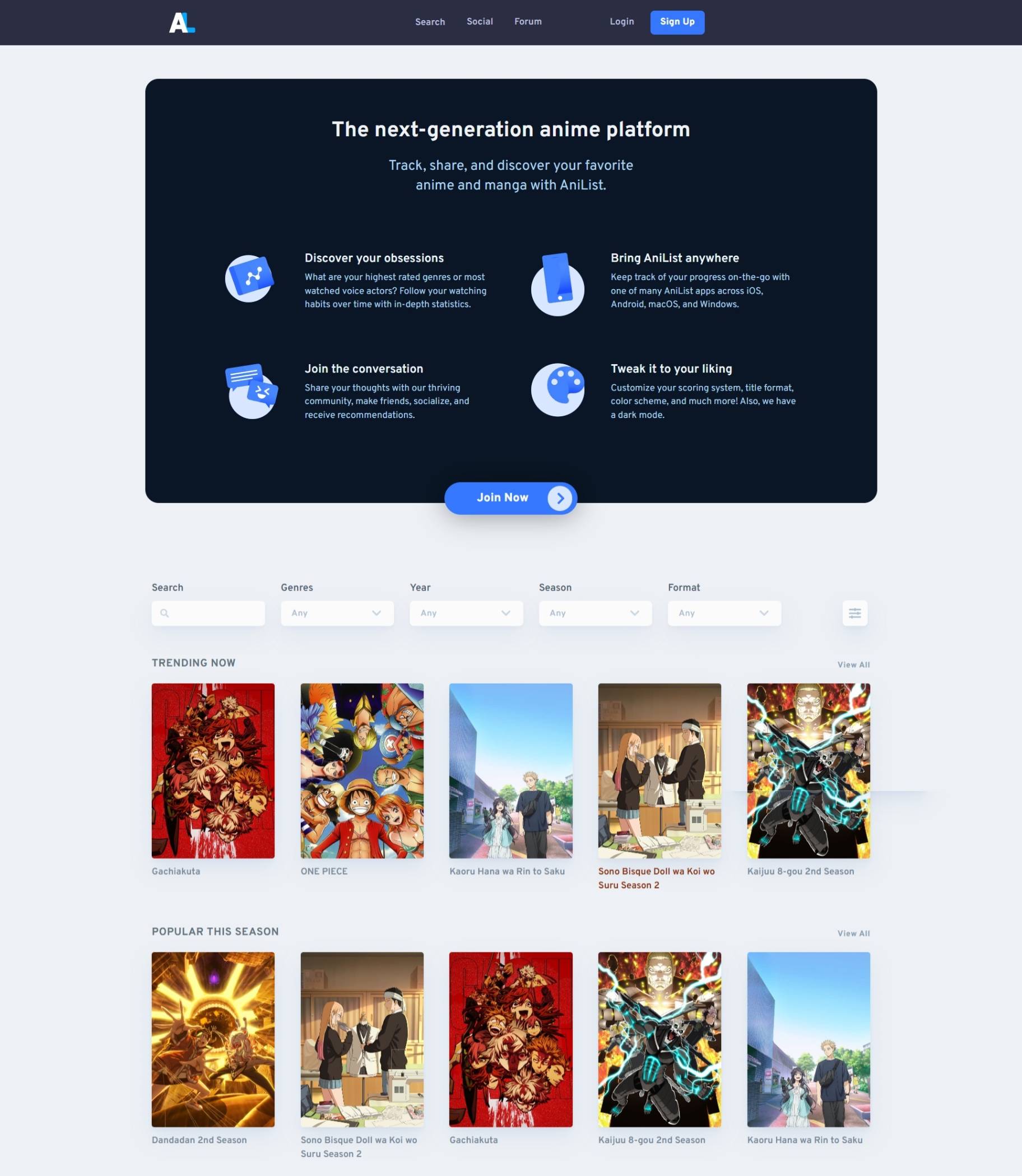 anilist这个也是动漫漫画百科信息提供网站,该网站也可以对相关的动漫漫画作品进行评论、打分操作。anilist还可以查看每个季度的新番动漫,并按照喜好进行筛选和排序。这个网站风格设计是简洁清新好看那种,是后起之秀的动漫漫画百科网站,也是收录非常多的动漫、漫画数据。