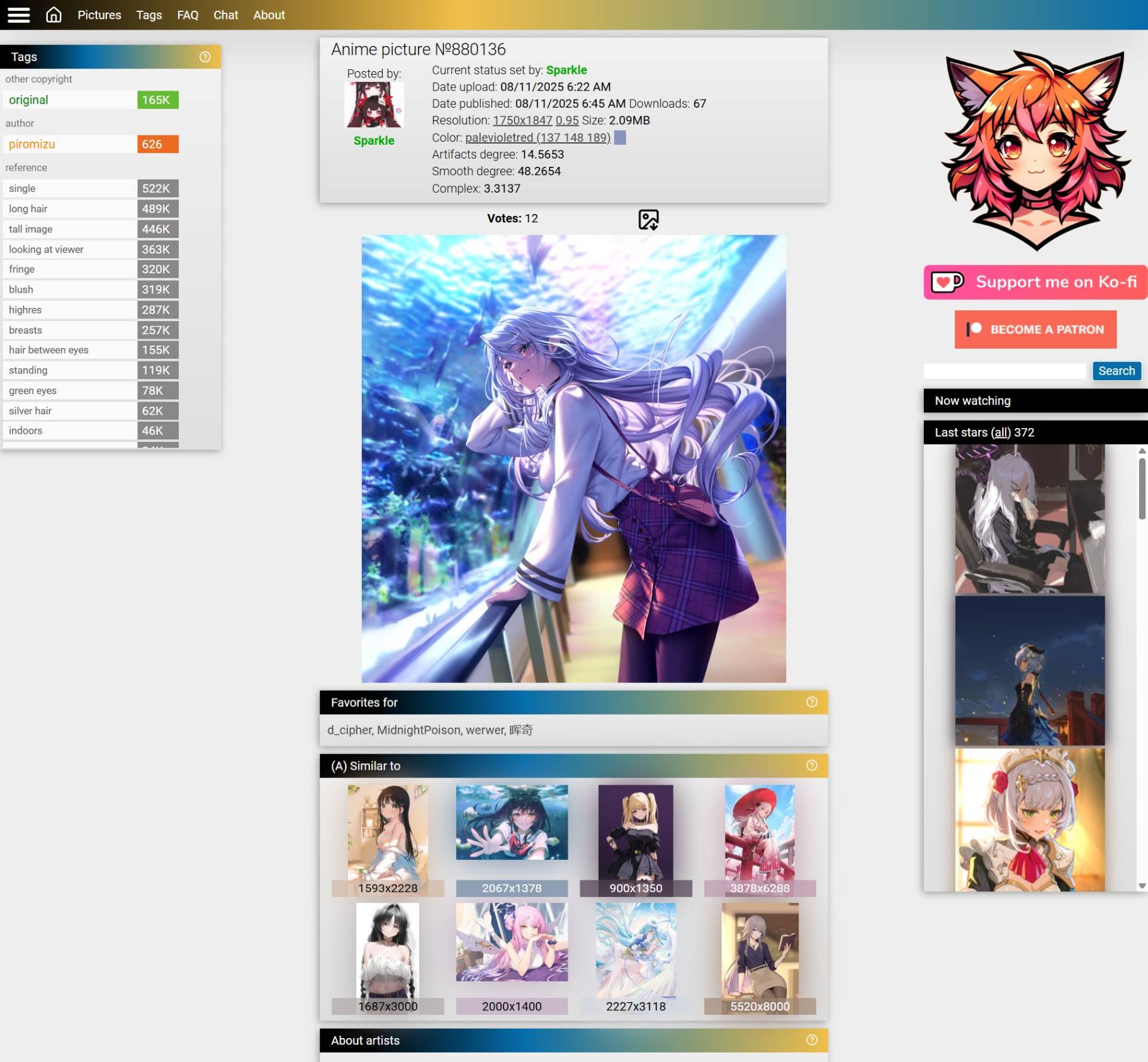 Anime-pictures支持标签分类查找以及搜索图片,还有收藏功能这些,除此之外还支持Color主要颜色图片查找,每一幅图片点击进去顶部有个显示Color的,例如Color: palevioletred (137 148 189),这是表示主要颜色是苍紫罗蓝色,你可以点击它然后寻找相同主要色的动漫图片。